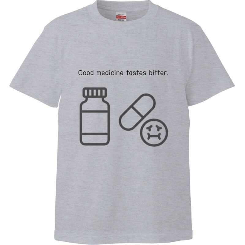「良薬は口に苦し(Good medicine tastes bitter. )」をシンプルにデザインしました。「良薬は口に苦し」は"自分のためになる忠告は聞き入れにくいこと"を意味することわざです。本当にそうですよね。自分のためになる言葉こそ受け入れにくいものですよね。