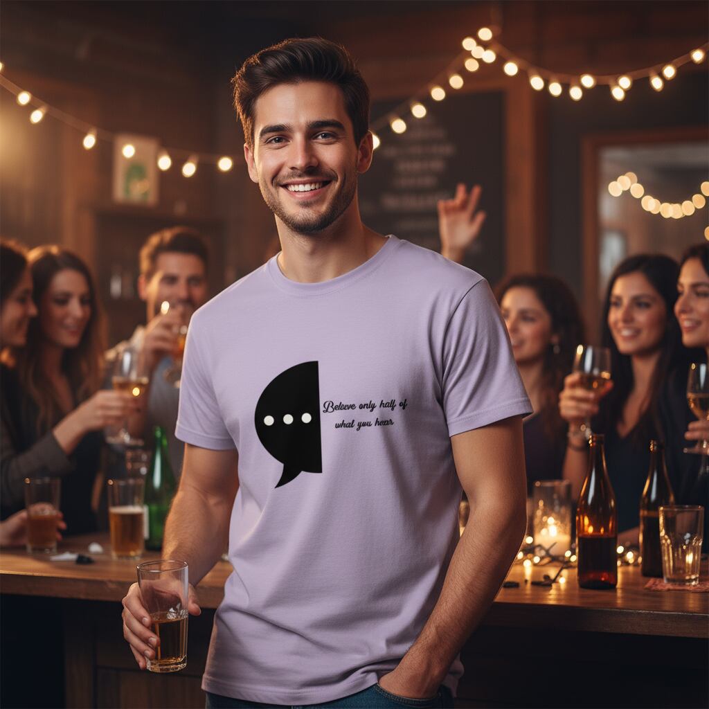 「話半分(Believe only half of what you hear)」をデザインしました。「話半分」とは"面白い話には嘘や誇張が含まれているから半分くらいに割引いて聞いておけばちょうどよい"という意味のことわざです。どんな話も話半分くらいの気持ちで聞いておけば、気が楽かもしれませんね。
