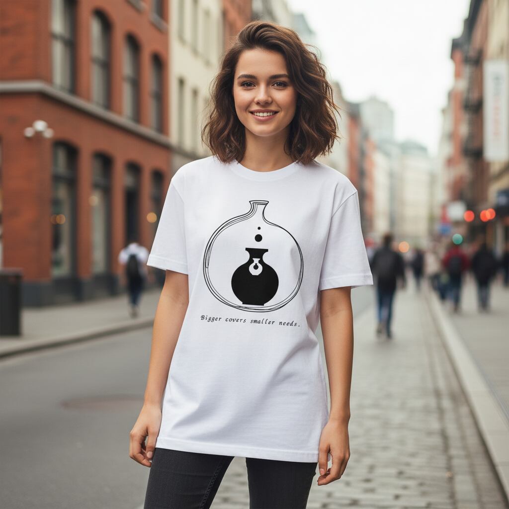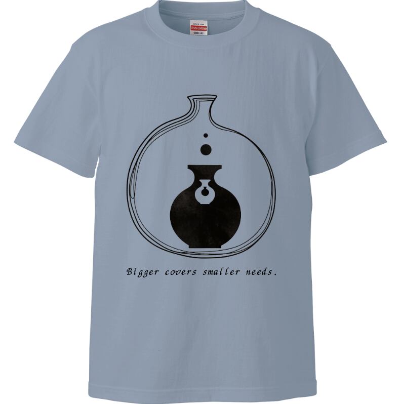 「大は小を兼ねる(Bigger covers smaller needs.)」をデザインしました。「大は小を兼ねる」は"大きなものは小さなものの代わりになる"ことを意味することわざです。代替できるにこしたことはありませんよね。