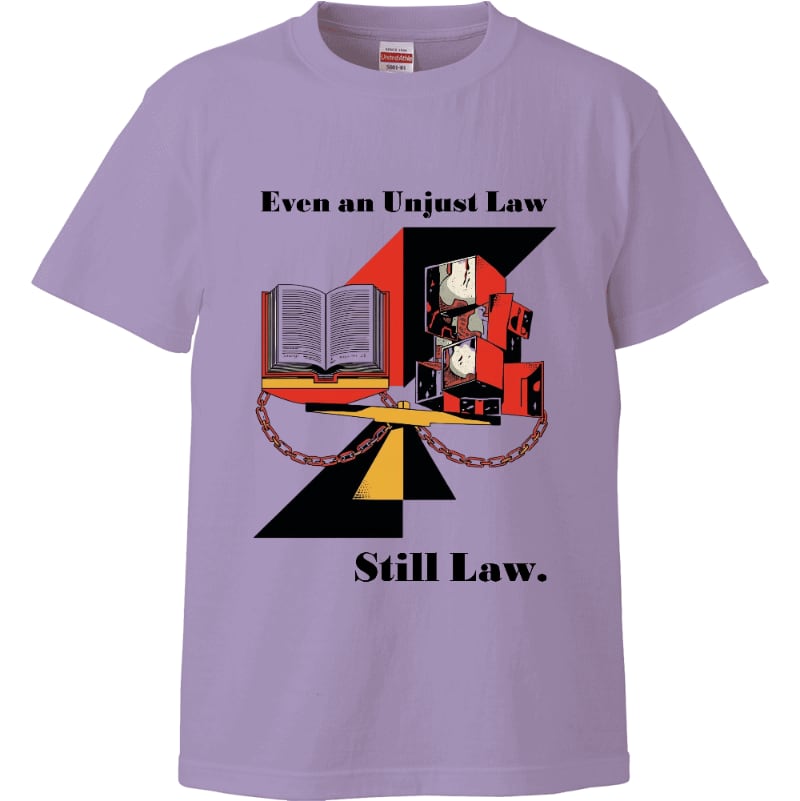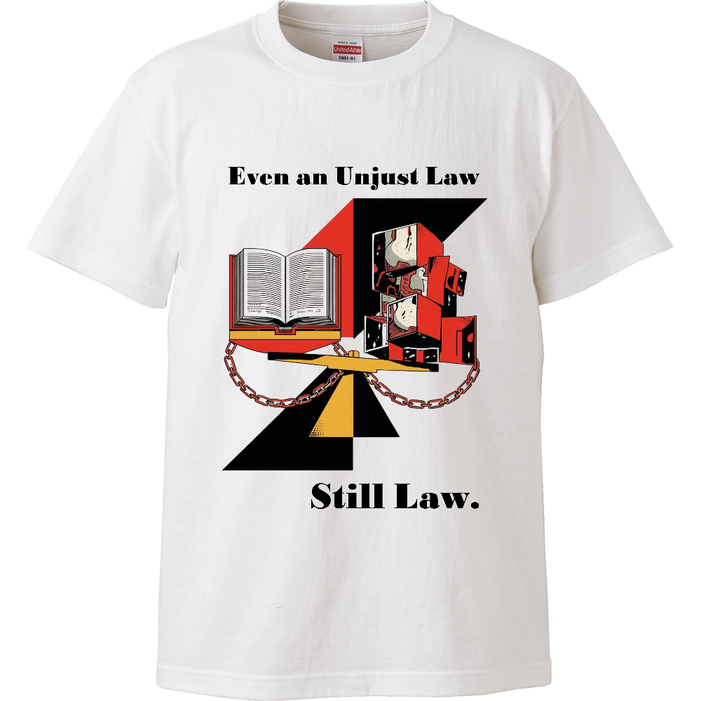 「悪法もまた法なり(Even an Unjust Law is Still Law)」をデザインしました。「悪法もまた法なり」は"悪い法律であっても法は法であるから、通用している間はそれを守らなければならないということ"を意味することわざです。色々な法改正があり、納得できない所もありますけど、法律は法律ですから、守らなければなりませんね。